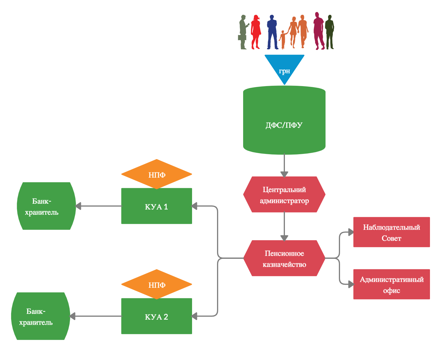Центральный администратор направляет средства на единое пенсионное казначейство, которое перебрасывает их на авторизованные КУА. Те управляют деньгами и отчитываются перед Пенсионным казначейством. Красным цветом на рисунке обозначена та часть инфраструктуры, которой сейчас не хватает для нормальной работы такой модели.