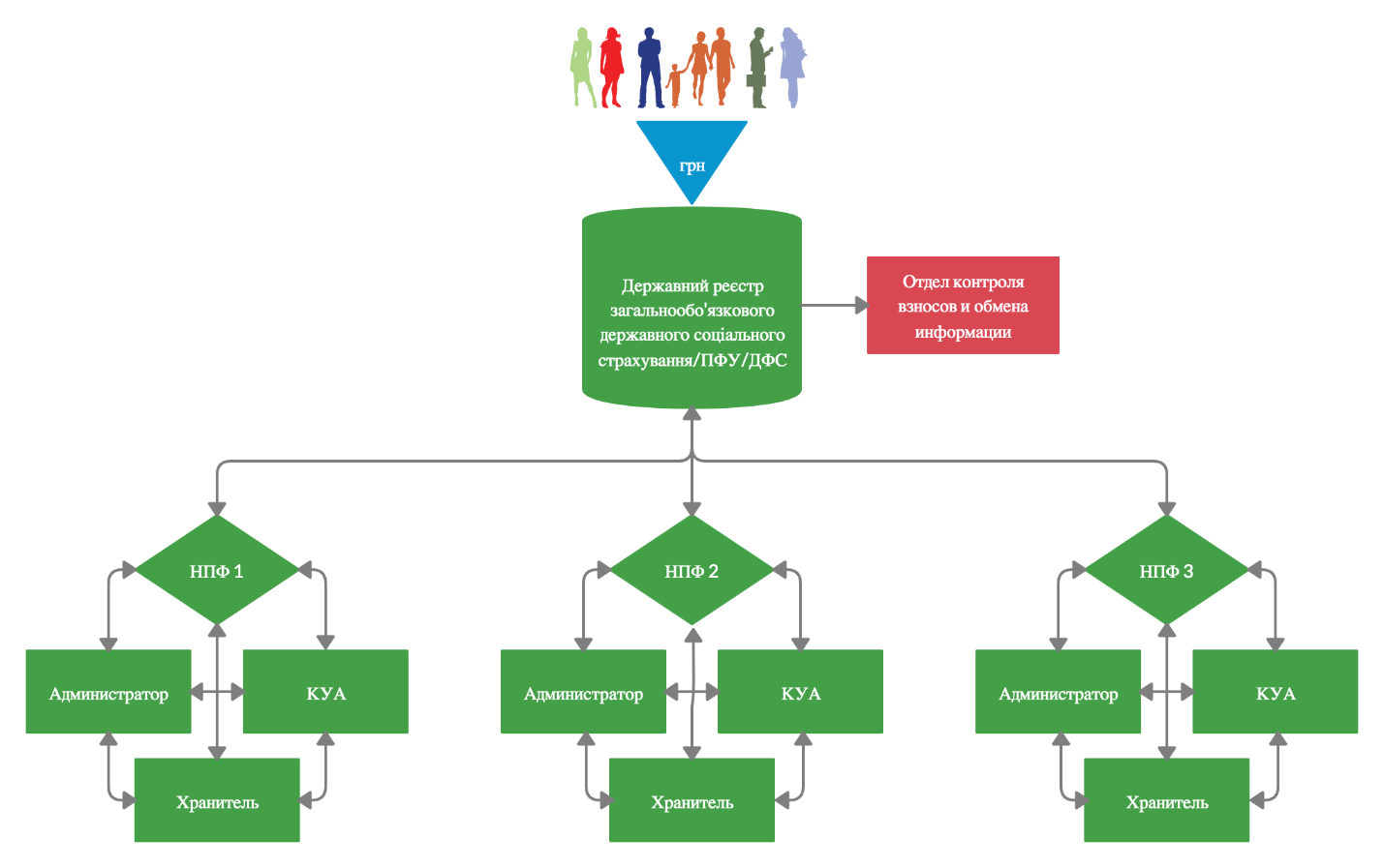 Во-вторых, люди/компании делают взносы через государственное казначейство, процесс контролируется ПФУ или ДФС, но в данной модели мы привязываемся к государственному реестру общеобязательного государственного социального страхования. При том органе, который будет вести этот реестр, формируется дополнительный отдел, который ведет контроль взносов и обмен информации с НПФ, в том числе, распределяет рандомным путем участников между НПФ, если они сами для себя не выбрали негосударственный пенсионный фонд.