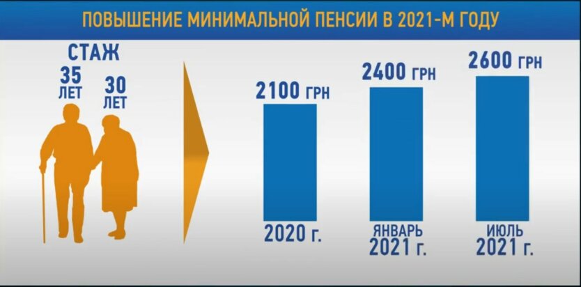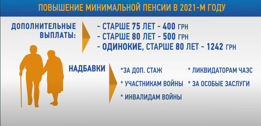 Так, с января 2021 года минимальная пенсия для людей старше 60 лет со стажем более 30-35 лет составит 2 400 гривен. В июле она возрастет на 200 гривен. Тогда же введут выплаты людям старше 75 лет.